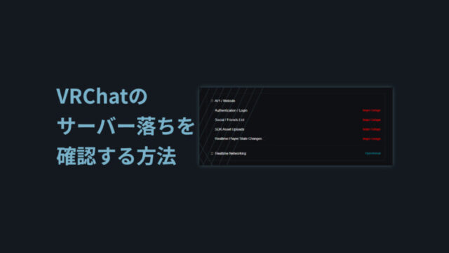 VRChat VRChatのサーバー落ちを確認する方法【鯖落ち】 VRChat公式のサーバーページにアクセスすると状況が分かります。サーバーは「API / Website」と「Realtime networking」の2つの表記があり、どちらかが「Major Outage」になっているとサーバーが落ちてます。 2026.03.18 VRChat