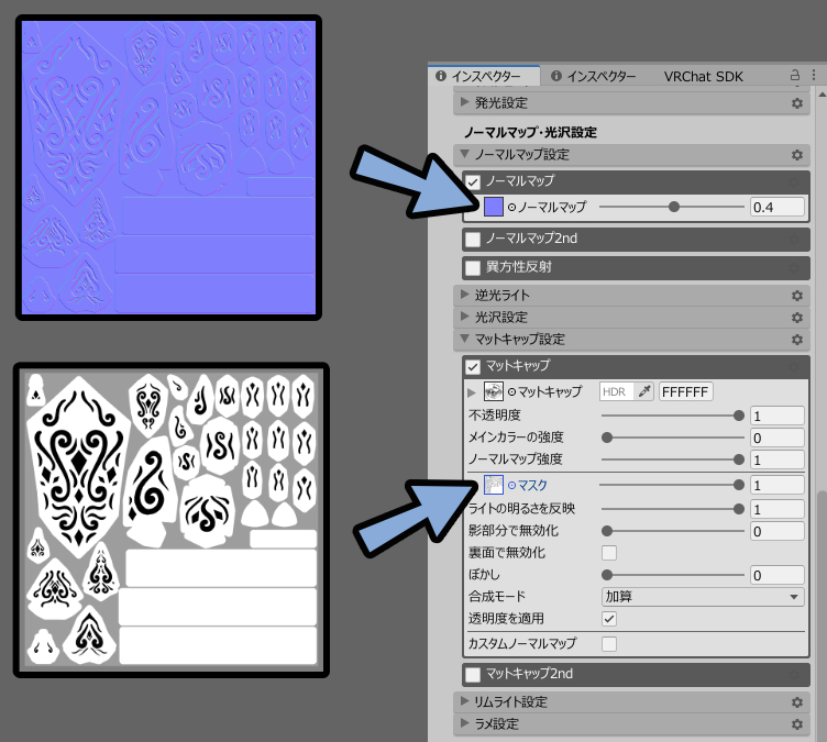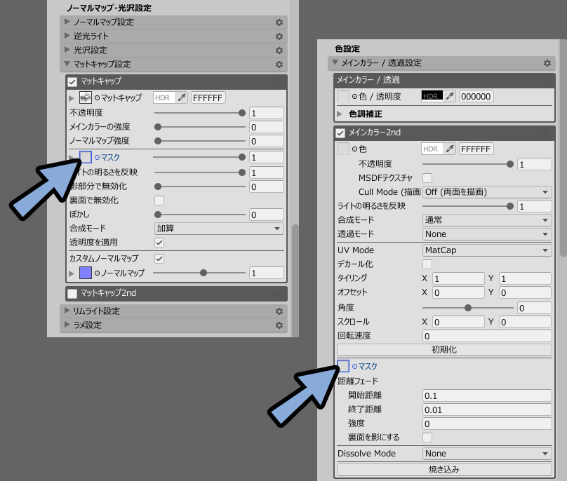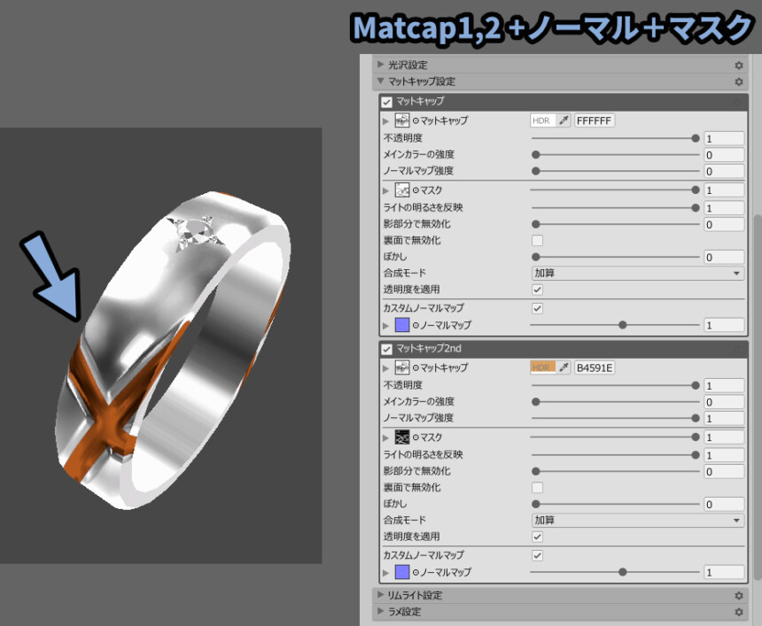 もう一つは「Matcap1と2」+「ノーマルマップとマスク」ですが…