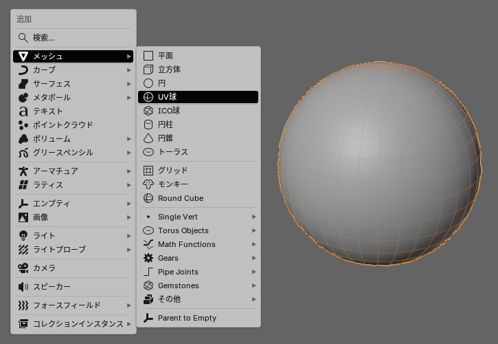 そこでShift+Aキー → メッシュ → UV球を作成。