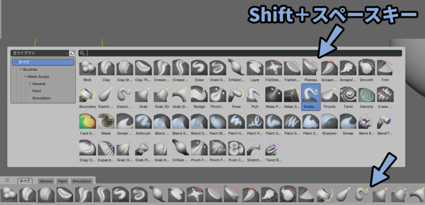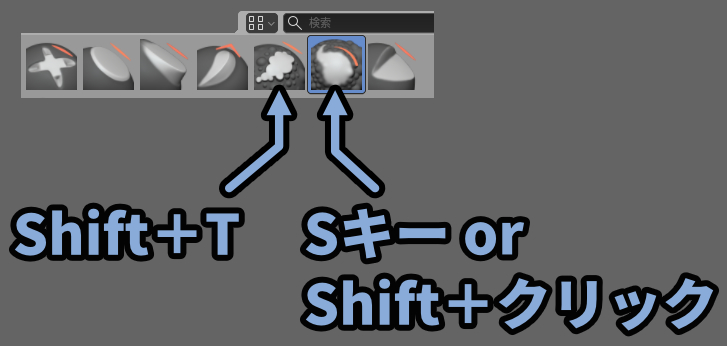 画面下部、もしくはShift+スペースキーでブラシを選べます。