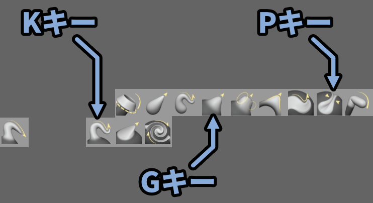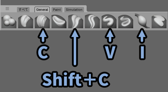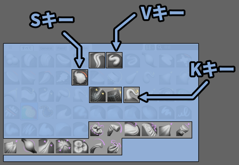これがスカルプトのブラシショートカットキーです。