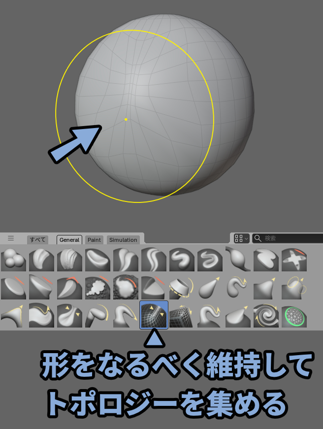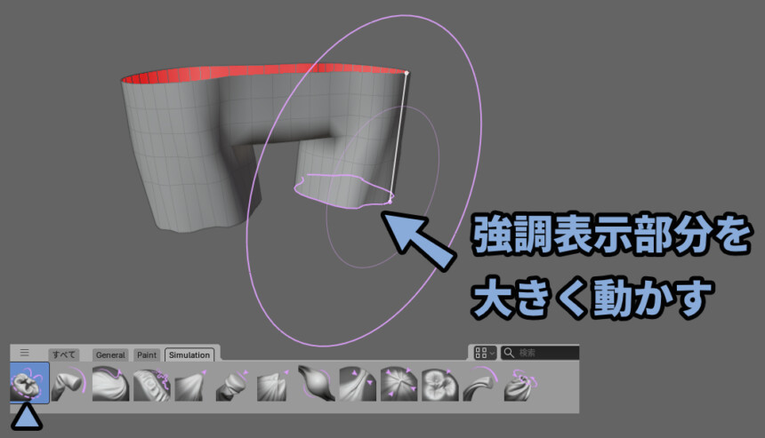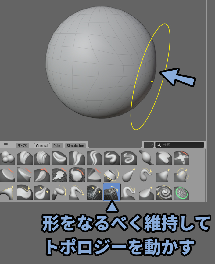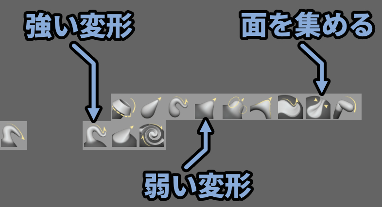 右側は形状をなるべく維持したままトポロジーをスライドさせるブラシです。