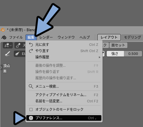ショートカットキーの確認は編集 → プリファレンスで行えます。