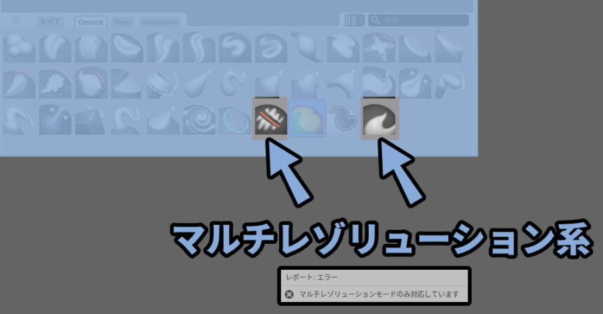 マルチレゾリューションというモディファイアを追加しないと動作しないブラシがあります。