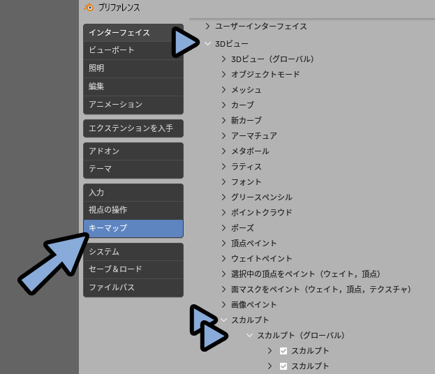 ここの「キーマップ」 を開きます。