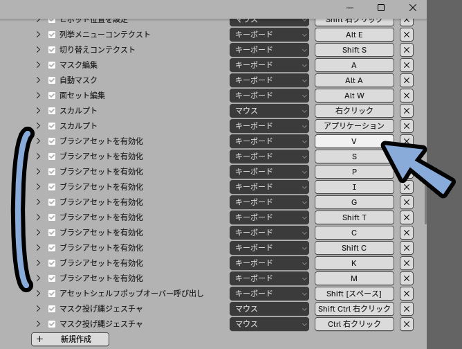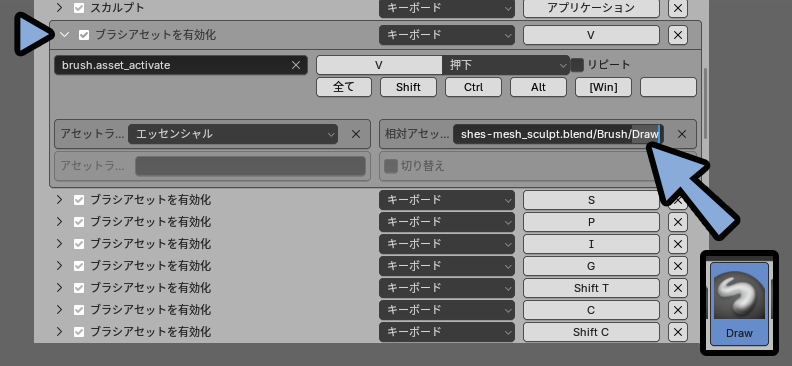 ここに表示された「ブラシアセットを有効化」に対応するキーが出てきます。