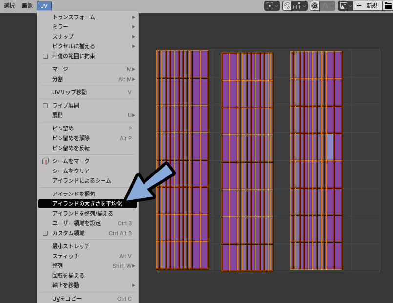 あとはUVを全選択 → アイランドの大きさを平均化あたりで大きさを調整します。