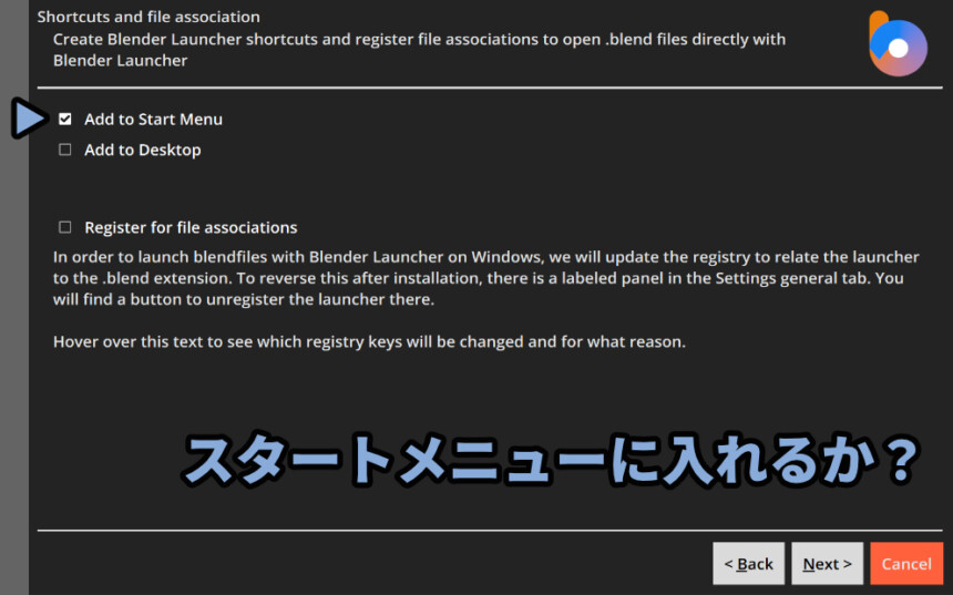 次にスタートメニューにBlender Launsherを入れるかを聞かれます。