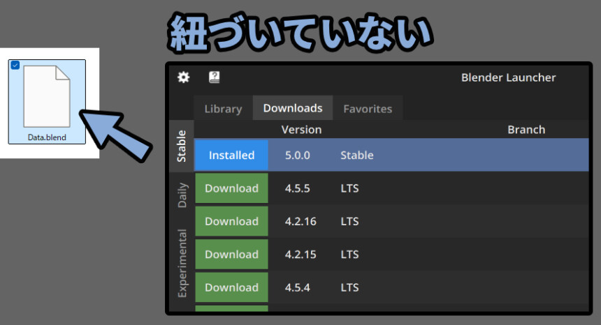 これはBlender Launcher経由で入れたBlenderと.blendファイルが紐づいてないのが原因です。