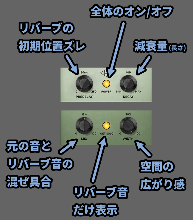 ・Mix → 「リバーブ前の音」と「リバーブ後の音」との混ぜ具合