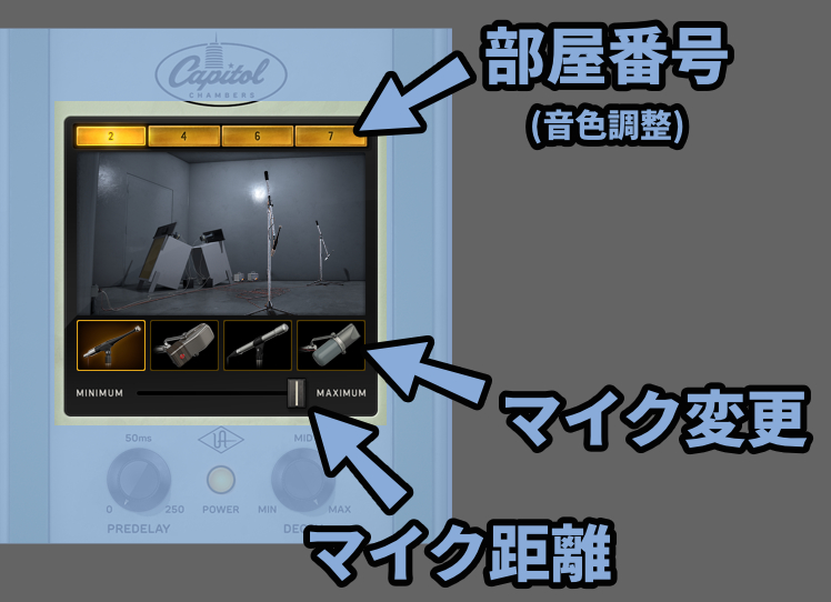 ・上部の画面で「反響室の番号」と「マイクの設定」を変えれる