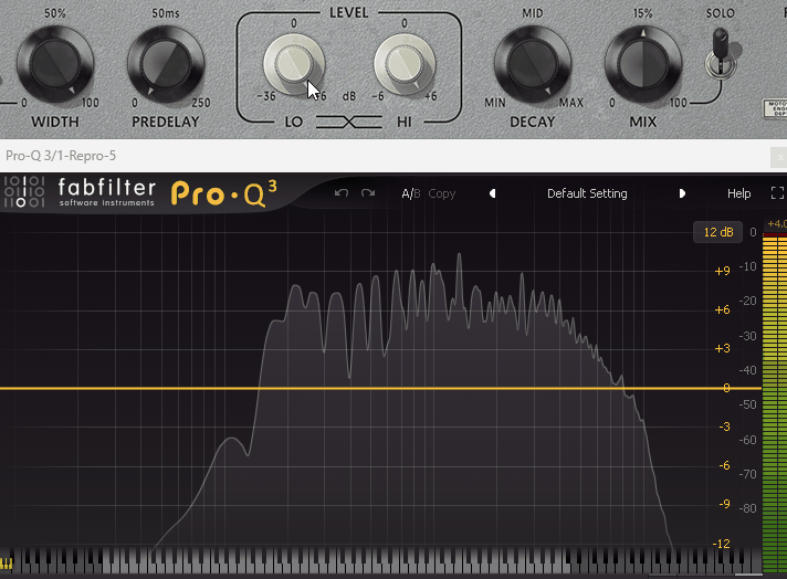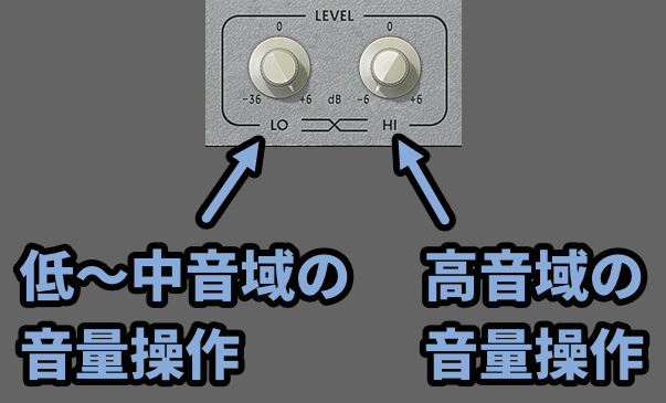 このフラグインの真ん中に「低~中音域」と「高音域」の音量を操作するEQがあります。