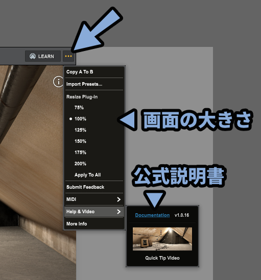 右上の「…」を押すと画面サイズを変えたり、Helpより公式ドキュメントが閲覧できたりします。