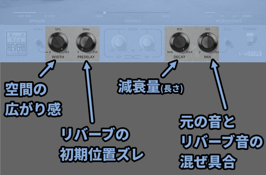 ・Mix → 「リバーブ前の音」と「リバーブ後の音」との混ぜ具合