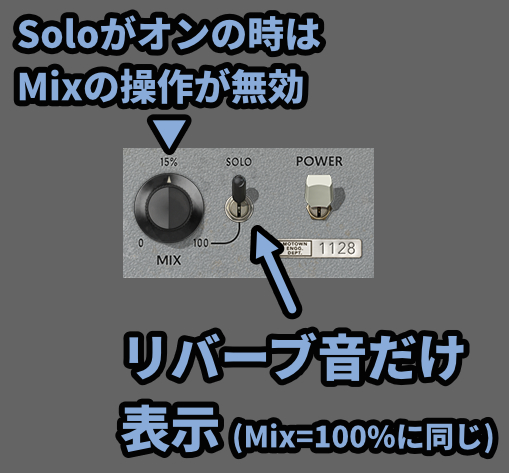 SoloはMix100%の状態、リバーブの音だけが聞こえる状態になります。