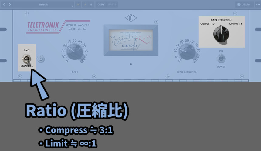 左下の「LIMT / COMPRESS」は圧縮比、Ratio変更です。