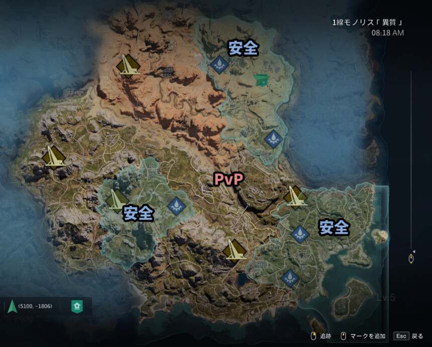 マップの中に「PvPじゃない(安全)」と「PvP」エリアの2つがあるシナリオです。