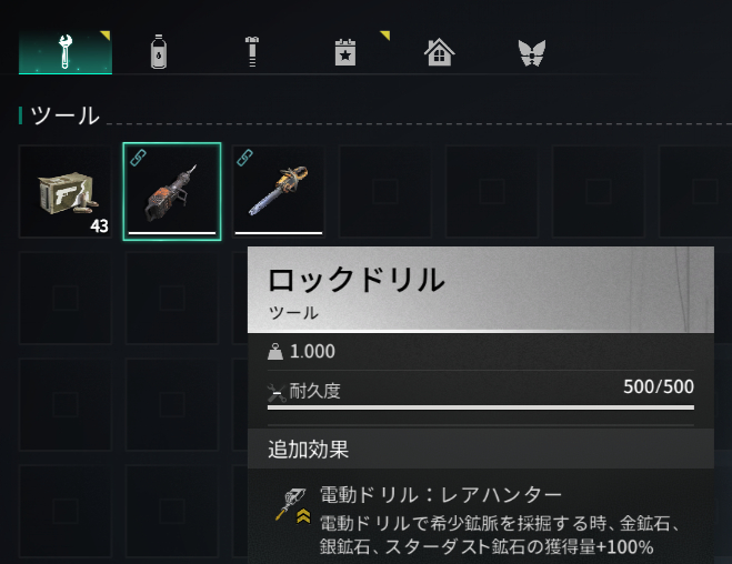 まず木と銅を取るために「ドリル」と「チェーンソー」を継承。
