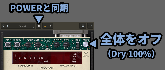 ここのPOWER、もしくは上部のINボタンを押すとリバーブエフェクトを無効化できます。