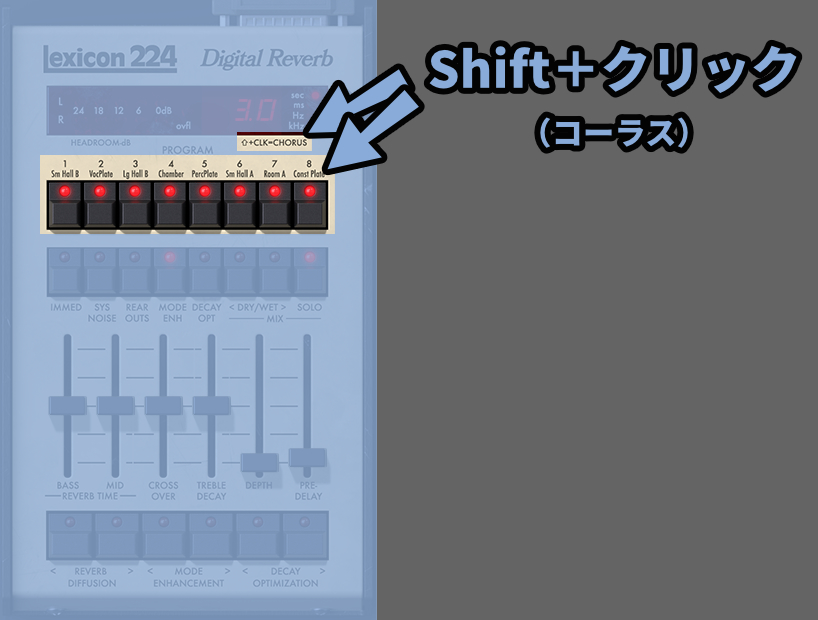 コーラス時はBass/midやDecayといったリバーブの基本的パラメーターなどの影響が無効になります。