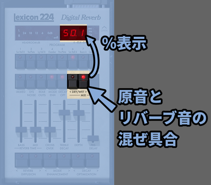 DRY/WETの所を押すと原音とリバーブ音の混ぜ具合を調整できます。