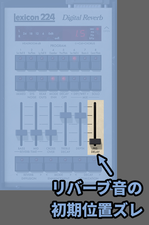 Pre Delayを操作するとリバーブ音の初期位置ズレを操作できます。